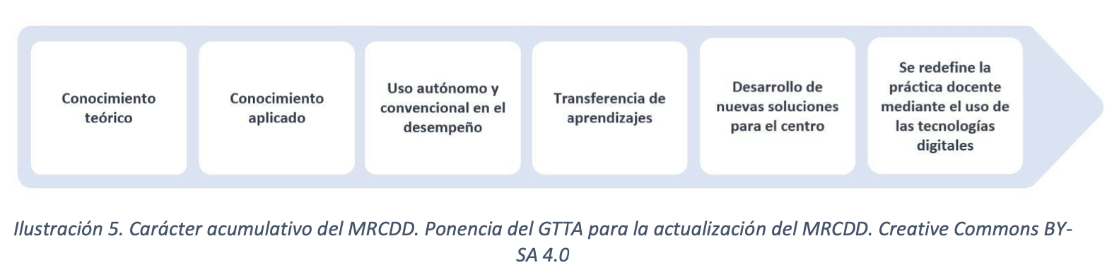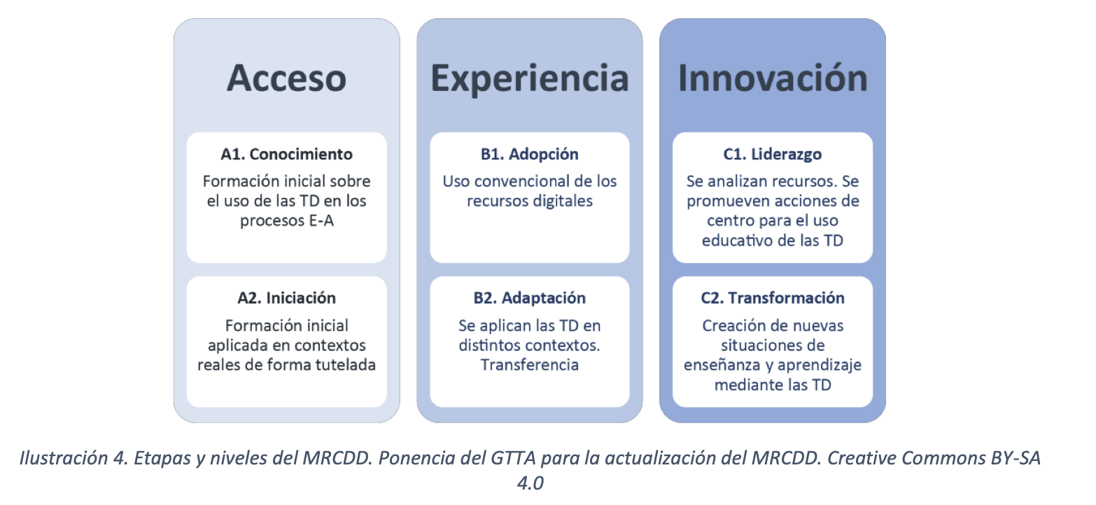 El Marc de Referència de la Competència Digital Docent (MRCDD) manté l'estructura del DigCompEdu en sis àrees, que són cadascuna de les categories en les quals s'organitzen les competències digitals dels docents dins del marc i es centren en diferents aspectes de les activitats professionals dels docents: